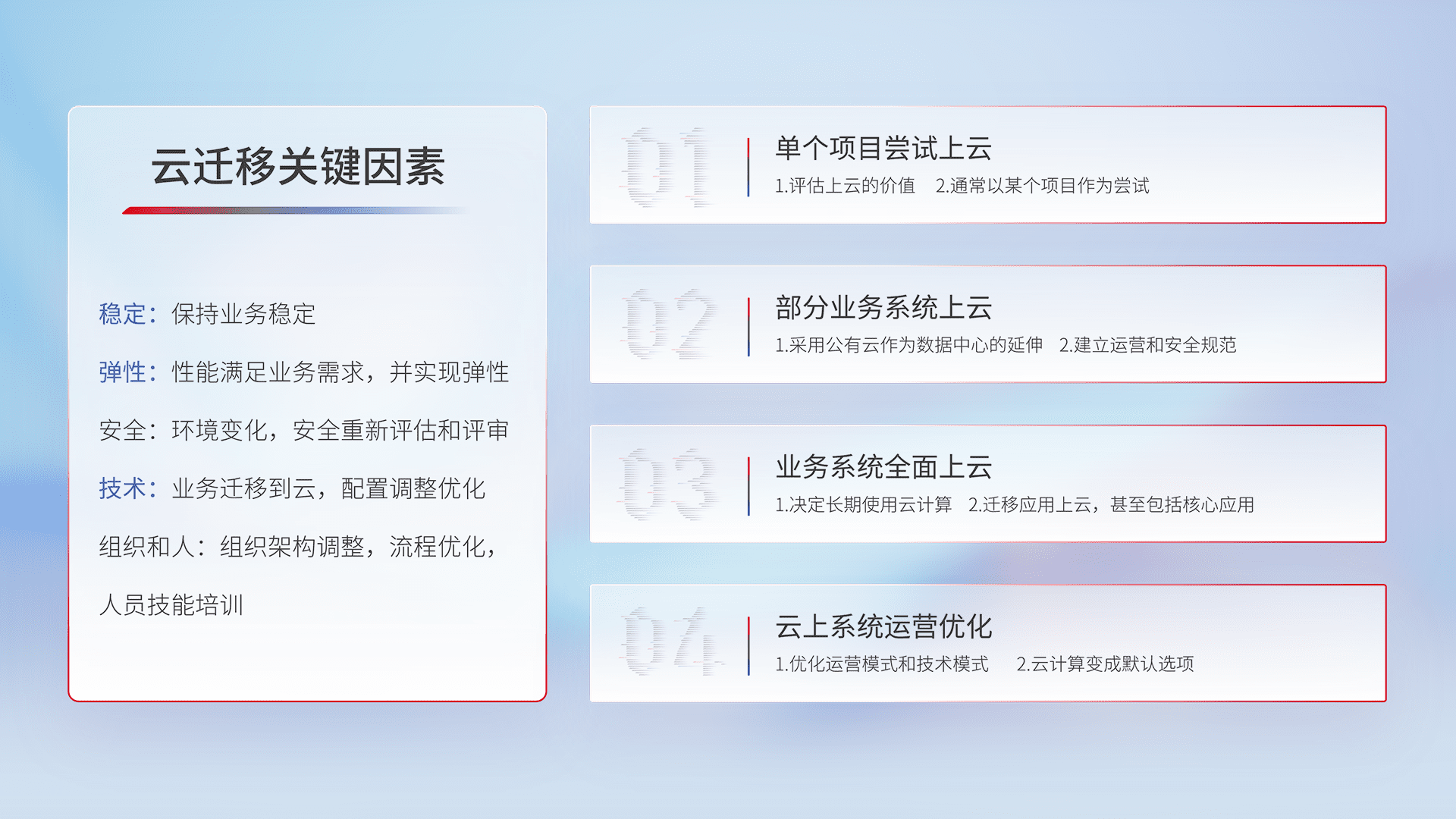 结合实际业务,,,,从规划设计、、、云平台选型、、、、云原生改造、、、、数据迁移、、、、集成交付,,迁移全过程为客户识别最佳上云路径,,,,做好风险识别管理,,,设计网络架构、、、身份权限、、安全审计合规、、、操作审计、、、、日志审计、、监控告警策略、、、、多站点容灾设计等,,对云上基础设施进行整体规划,,提升IT治理水平,,,以满足弹性、、高可用、、高性能的需求。。。。