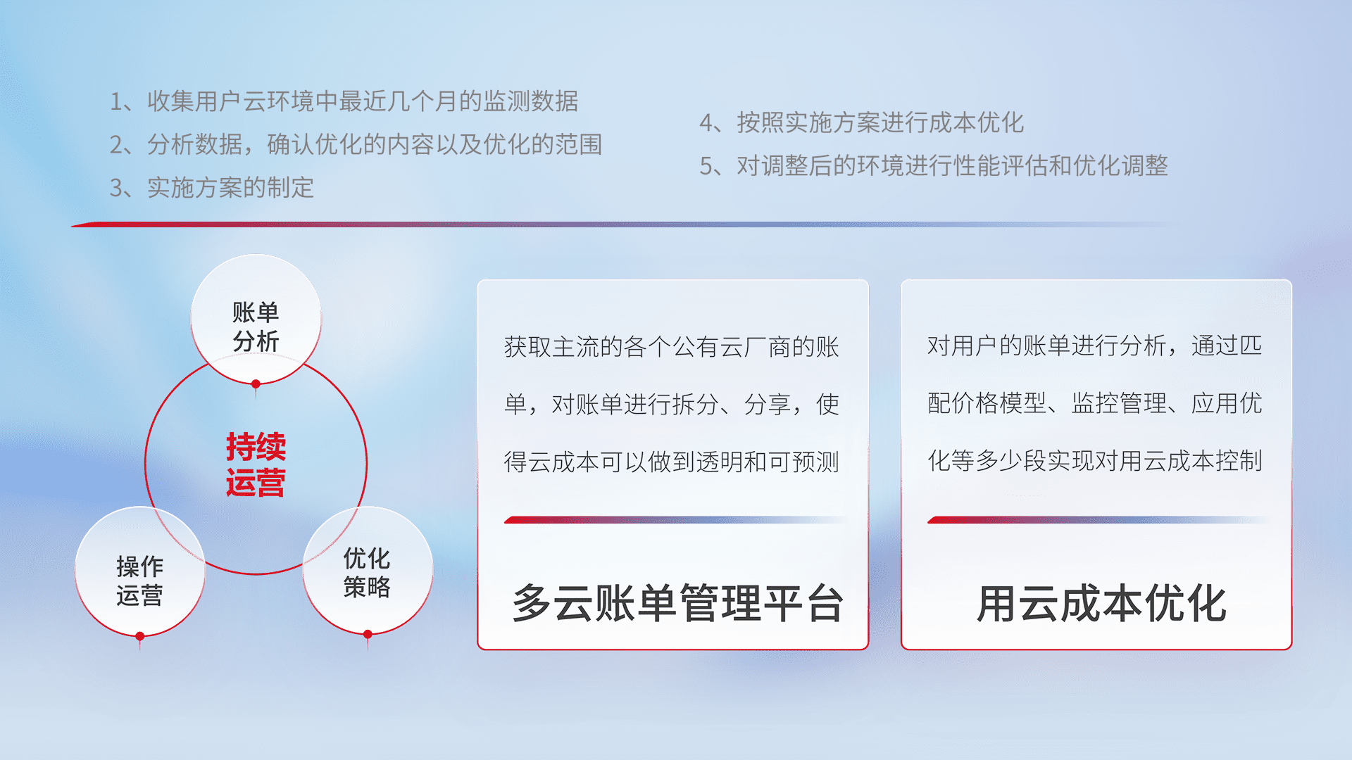 通过多云纳管,,以统一的资源数据模型把客户的云资源进行抽象和封装,,进而实现对多云资源的统一操作,,,保障云资源管理的可靠性、、、、稳定性与可用性。。。量身定制化运维内容,,,配置、、、开发运维、、、补丁管理、、备份、、、、监控、、、认证和访问管理、、、、审计和日常巡检等,,,保障在用云过程中的可靠度,,,稳定度以及高可用率。。。